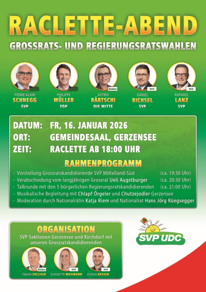 Die SVP Sektionen Gerzensee und Kirchdorf lädt am Freitag, 16. Januar 2026, ab 19.00 Uhr, anlässlich eines Racletteabends, mit musikalischer Umrahmung zu einem Wahlanlass für die Grossrats- und Regierungsratswahlen im Wahlkreis Mittelland Süd ein.