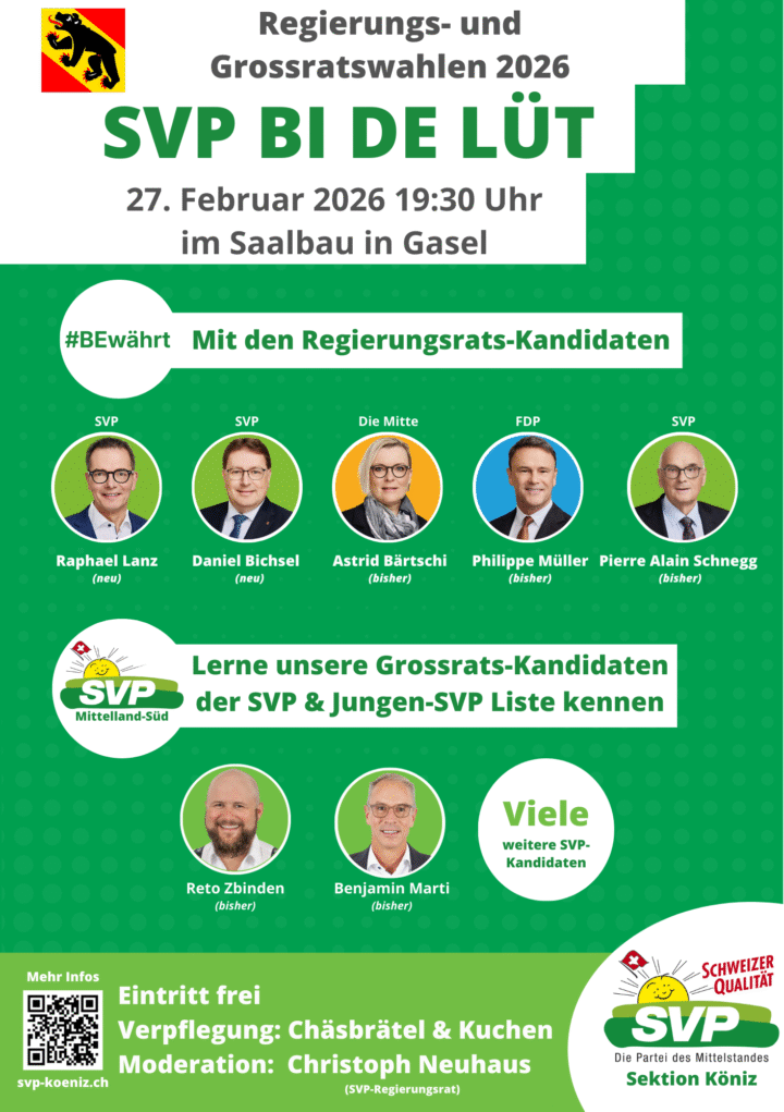 SVP bi de Lüt mit den fünf bürgerlichen Regierungsratskandidierenden und einer Vielzahl an Grossratskandidierenden. Der amtierende Regierungsrat Christoph Neuhaus führt durch den Abend und als Verpflegung geniessen Sie Chäsbrätel & Kuchen.
