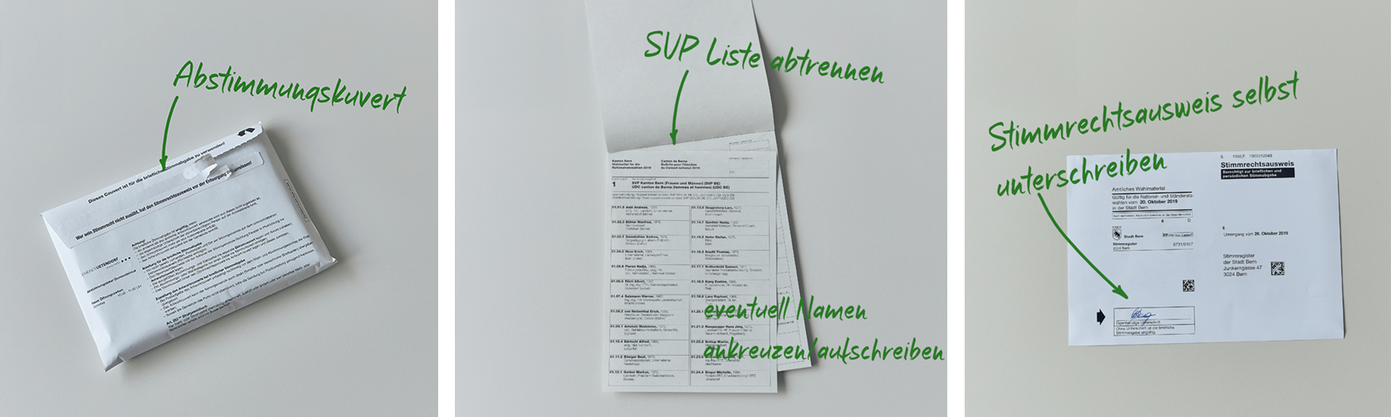 - Wahlzettel ins Stimmkuvert legen und rechtzeitig einwerfen oder abschicken. Unterschreiben Sie Ihren Stimmausweis, ansonsten sind alle Ihre Angaben ungültig!